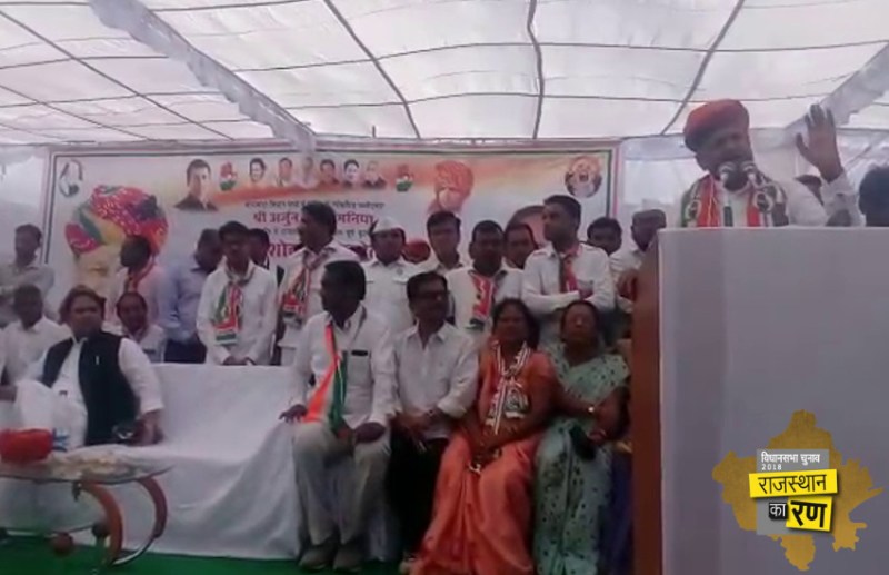सभा को संबोधित करते हुए गहलोत ने केंद्र और राज्य सरकार पर निशाना साधा। साथ ही अमित शाह के बयान पर तंज कंसते हुए कहा कि भाजपा के राष्ट्रीय अध्यक्ष आमलोगों को कानून हाथ में लेने को कह रहे है। इसके बाद सीएम वसुंधरा राजे पर कटाक्ष करते हुए कहा कि अमित शाह, नरेंद्र मोदी के साथ वसुंधरा राजे का 36 का आंकड़ा था लेकिन चुनाव में जीत के लिए राजे को अमित शाह के आगे झुकना पड़ा। उन्होंने कहा कि राजे को जनता के आगे झुकना चाहिए। उन्होंने कांग्रेस की सरकार के दौरान क्षेत्र में हुए विकास कार्यों को भी गिनाया और एक बार फिर से कांग्रेस की सरकार बनाने के लिए वोट मांगे।