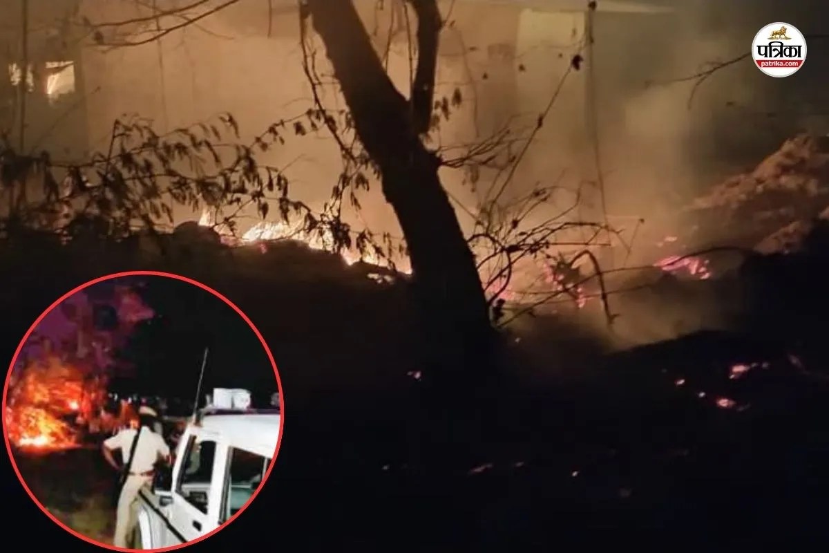 घरों से उठती आग की लपटें व इनसेट में बेबस होकर देखती पुलिस। फोटो: पत्रिका
