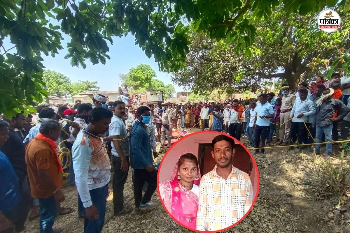 अरथूना में घटना के बाद मौजूद भीड़ व इनसेट में मृतक पति-पत्नी। फोटो: पत्रिका