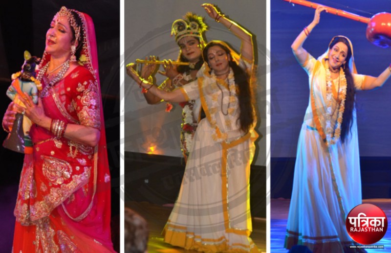 बांसवाड़ा. हेमामालिनी ने करीब ढाई घंटे तक मेरे तो गिरधर गोपाल दूसरों न कोई जा के सिर मोर-मुकट मेरो पति सोई...। छाडि़ दयी कुल की कानि, कहा करिहै कोई? आदि मीरां से जुड़े गीत-भजनों पर नृत्य किए। कृष्णभक्त कवयित्री मीराबाई रचित पदों तथा जीवन चरित्र पर घटित घटनाओं पर आधारित प्रस्तुतियों से दर्शक भाव विभोर हो गए। हेमामालिनी ने कृष्ण के प्रति मीरा की भक्ति को प्रभावी रूप पेश किया। मीरा बनी हेमा को देखने एवं गुरु आशीर्वाद के लिए पांडाल खचाखच भर गया।