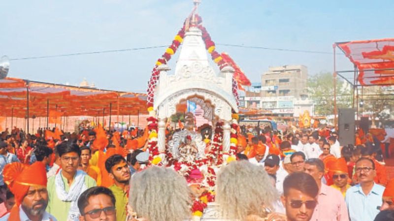 साथ ही एक जैसे परिधान में हजारों की संख्या में समाजजन शामिल हुए। करीब एक किलोमीटर लंबी शोभायात्रा में विभिन्न समाज की झांकियां और भजन मंडलियों ने समां बांध दिया साथ ही बच्चे महापुरुष व भगवान का वेश धारण किए हुए थे और जयकारों से पूरा परिक्षेत्र गूंज उठा।