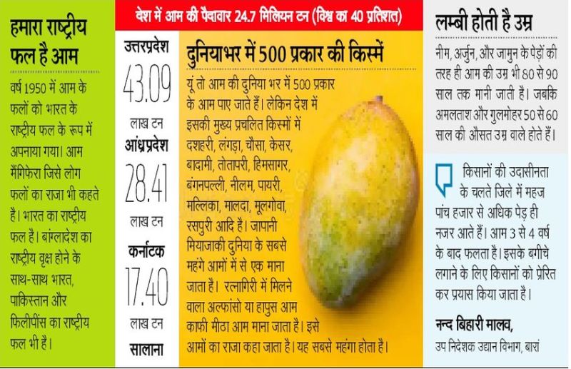 बारां. फलों के राजा आम का नाम नाम आते ही मुंह में पानी भर आता है। जिले में चार दशक पहले तक हजारों की संख्या में आम के पेड़ हुआ करते थे, लेकिन अब इनमें से दस फीसदी पेड़ भी शेष नहीं बचे। वर्तमान में उद्यान विभाग जिले में करीब पांच हजार से अधिक आम के पेड़ मौजूद होने का दावा करता है। अब यह पेड़ खेतों की मेढ़ आदि पर ही नजर आते हैं। जिले में आम का एक भी बगीचा अभी अस्तित्व में नहीं है। देश में आम की कई प्रजातियां उपलब्ध हैं, मगर लोगों को कुछ ही का स्वाद पता है।