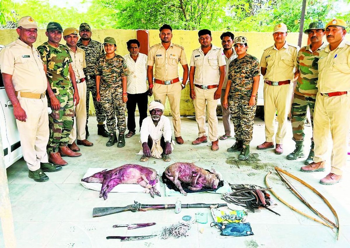 क्षेत्रीय वन अधिकारी जितेंद्र खटीक ने बताया कि गुरुवार को रेंज की उडऩदस्ता टीम एवं किशनपुरा नाके की टीम वालंटियर्स की सहायता से अवैध रूप से तेंदूपत्ता निकासी की रोकथाम के लिए गश्त कर रही थी। पैदल गश्त के दौरान टीम को एंटीपोङ्क्षचग भरतपुर के पास पीछे पहाड़ी पर हलचल सुनाई दी। यह सुनकर टीम सतर्क हो गई। इसके बाद टीम ने इलाके की चारों तरफ से घेराबंदी कर दी। घटनास्थल पर पहुंचने पर टीम ने देखा कि तीन शिकारी किसी वन्यजीव को ले जाते नजर आए। जब टीम इनके पास पहुंचने लगी तो इनके साथ मौजूद पालतू कुत्ते शोर करने लगे। वर्दी में टीम नजर आने पर वे वन्यजीव का शव, तांबे के सामान व टोपीदार बंदूक को मौके पर ही फेंक कर तीनों शिकारी भागने की कोशिश करने लगे। थोड़ी दूर ही एक आरोपी कालूलाल पुत्र गेंदीमल निवासी अकावदखुर्द वन विभाग की टीम की गिरफ्त में आ गया। उससे मौके से दो मृत जंगली सूअर, बंदूक में भरने के लिए विस्फोटक, छुरा भी बरामद किया गया। मृत जंगली सुअरों को कोटा चिडिय़ाघर पोस्टमार्टम के लिए भेजा गया है।