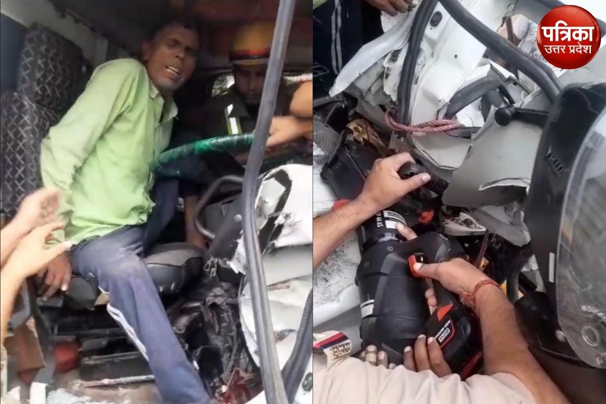 स्टीयरिंग में फंसे चालक को निकालती पुलिस (फोटो सोर्स: पत्रिका)