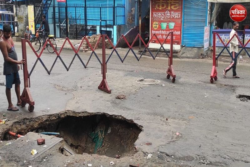 चौपुला स्थित दीपमाला अस्पताल के पास धंसी सड़क (फोटो सोर्स: पत्रिका)