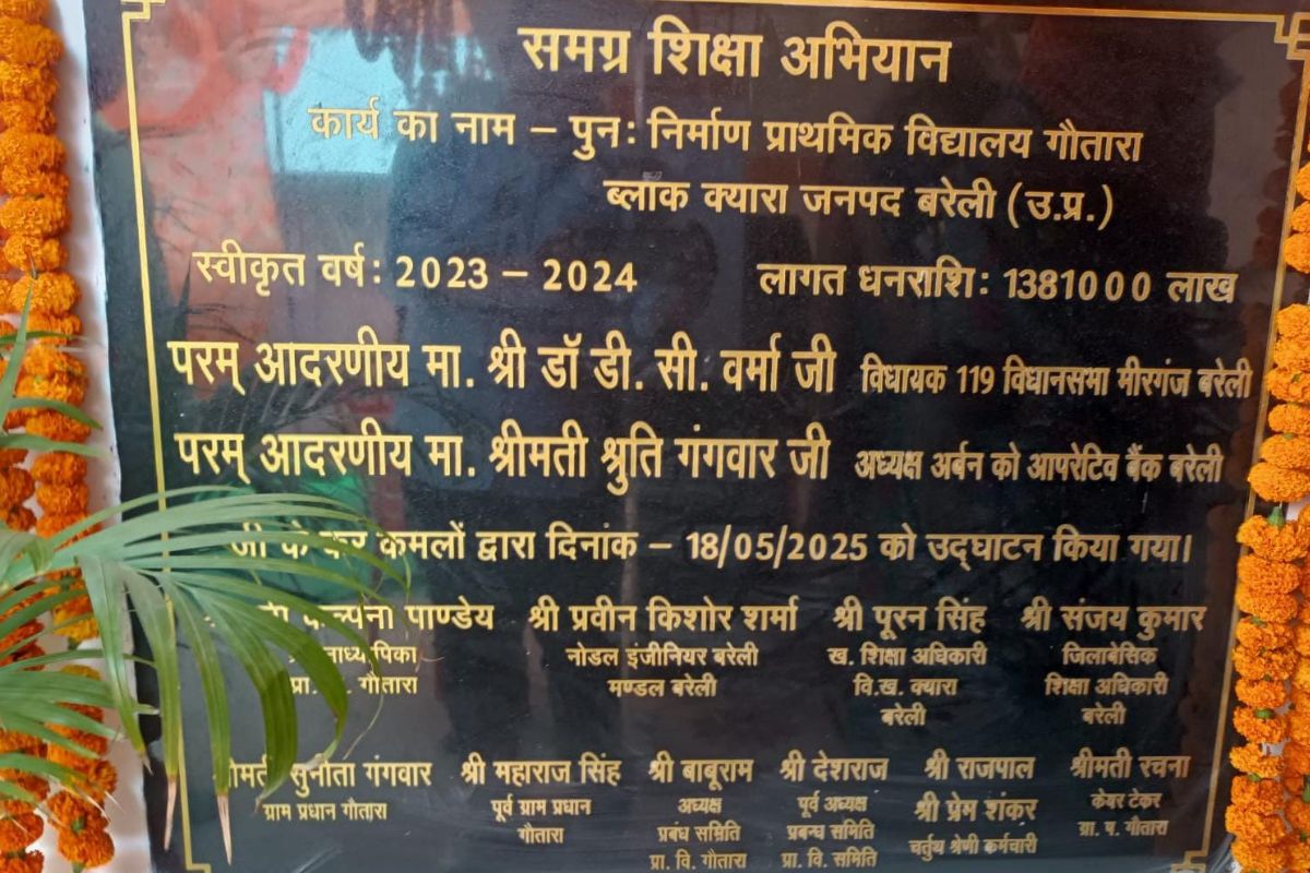शिलापट में गांव के चौकीदार, ग्राम प्रधान सुनीता गंगवार, पूर्व प्रधान महाराज सिंह, प्रबंध समिति के अध्यक्ष बाबूराम, नोडल इंजीनियर प्रवीण किशोर शर्मा, खंड शिक्षा अधिकारी पूरन सिंह, जिला बेसिक शिक्षा अधिकारी संजय कुमार सहित कई नाम दर्ज हैं — लेकिन सांसद छत्रपाल सिंह गंगवार का नाम पूरी तरह गायब है।