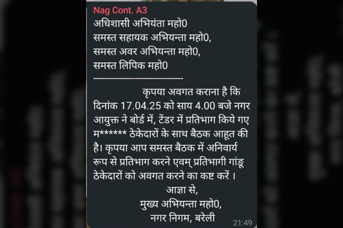 बरेली। विकास कार्यों को लेकर बुलाई गई समीक्षा बैठक की सूचना जैसे ही ठेकेदारों के ग्रुप पर डाली तभी एक ठेकेदार ने उस मैसेज में बदलाव कर अभद्र भाषा का प्रयोग करते हुए मैसेज ग्रुप में डाल दिया। इसके बाद नगर निगम में बवाल मच गया। गुरुवार को समीक्षा बैठक हुई तो ठेकेदार के खिलाफ अधिकारी एक्शन में आ गए। अभी तक दिए गए उसको कामों के वर्क ऑर्डर निरस्त करने के प्रक्रिया शुरू हो गई। कार्रवाई यहीं नहीं थमी ठेकेदार की फर्म को ब्लैक लिस्ट करने और कोई काम न देने का फरमान जारी हुआ।