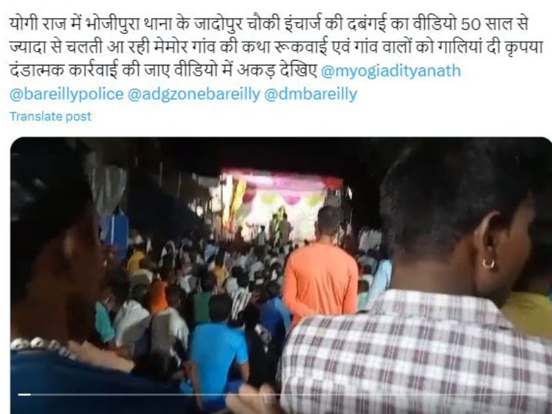 मोनू अग्रवाल ने एक्स (ट्वीटर) पर एक ट्वीट कर वीडियो साझा किया है। वीडियो भोजीपुरा थाना क्षेत्र के मेमोर गांव का बताया जा रहा है। गांव में हो रही कथा को रुकवाने जादोपुर चौकी इंचार्ज मंच पर पहुंचे। दरोगा ने मंच से माइक लेकर गांव वालों को धमकाया। दो मिनट में कथा बंद करने की धमकी दी। चौकी इंचार्ज ने कहा इतिहास रच दूंगा महाभारत में, दो मिनट में बंद करो, दो मिनट में पब्लिक उठ जाए यहां से। मंच पर दरोगा ने गाली गलौज भी की। इस मामले की में सीओ नवाबगंज को जांच कर कार्रवाई करने के निर्देश दिए गए है।