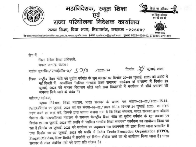 निदेशक शिक्षा मंत्रालय भारत सरकार ने 24 जुलाई को सभी प्रदेशों को चिट्ठी भेज दी है। इसमें कहा गया कि प्रधानमंत्री नरेंद्र मोदी अखिल भारतीय शिक्षा समागम कार्यक्रम का 29 जुलाई को उद्घाटन करेंगे। उद्घाटन सत्र का लाइव स्ट्रीमिंग वेबकास्ट विद्यालय स्तर तक प्रसारित किया जाएगा। इसके साथ ही उद्घाटन सत्र में विद्यालय स्तर पर प्रतिभाग करने वाले सभी शिक्षक छात्रों को मामले में इकट्ठा करने के निर्देश दिए। जिससे वह सजीव प्रसारण को देख सकें।