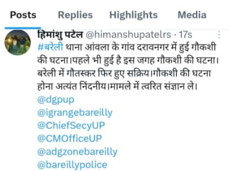 एक्स (ट्वीटर) पर हिमांशु पटेल ने डीजीपी, एडीजी, आईजी, बरेली पुलिस से शिकायत कर एक वीडियो भी साझा किया है। ट्वीट कर लिखा कि थाना आंवला के गांव दरावनगर में गौकशी की घटना हुई है। इससे पहले भी घटना हो चुकी है। बरेली में गौतस्कर फिर सक्रिय हुए है। थाना पुलिस गौकशी की घटना को ट्रेन से कटा हुआ बता रही है। रात की घटना में अभी तक मुकदमा पंजीकृत नहीं हुआ है। उन्होंने कार्रवाई की मांग की है। इस मामले में थाना आंवला प्रभारी बरेली को अभियोग पंजीकृत कर कार्रवाई करने के निर्देश दिए गए है।
