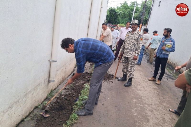 फावड़े से सिल्ट निकालते नगर आयुक्त (फोटो सोर्स: पत्रिका)