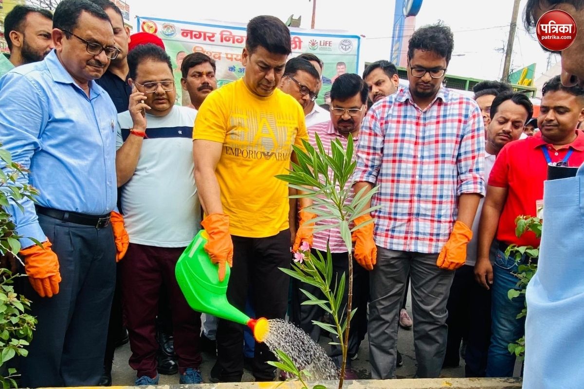 विश्व पर्यावरण दिवस पर पौधारोपण करते मेयर उमेश गौतम व मौजूद अन्य अधिकारी (फोटो सोर्स: पत्रिका)