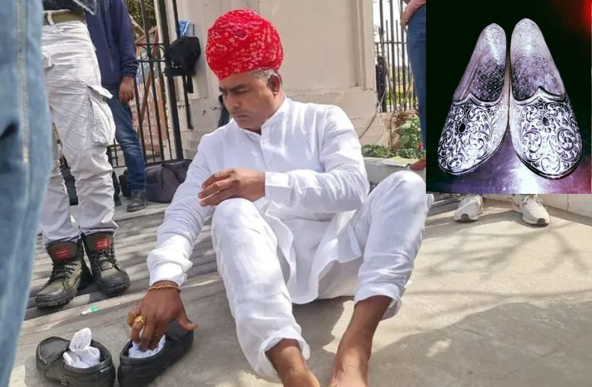 Rajasthan New District : बाड़मेर के पचपदरा विधानसभा से कांग्रेस के विधायक मदन प्रजापत ने बालोतरा को जिला बनाने की मांग को लेकर संकल्प लिया था कि जब तक बालोतरा जिला घोषित नहीं होता वह जूते नहीं पहनेंगे। सीएम गहलोत के 19 जिलों की घोषणा के बाद उनका संकल्प पूरा हुआ तो समर्थकों ने उनके लिए चांदी के जूते बनवा दिए। विधायक प्रजापत ने सीएम हाउस में मुख्यमंत्री अशोक गहलोत की मौजूदगी में चांदी के जूते पहनकर अपना संकल्प पूरा किया। ये जूते 750 ग्राम चांदी से बनाए गए है।