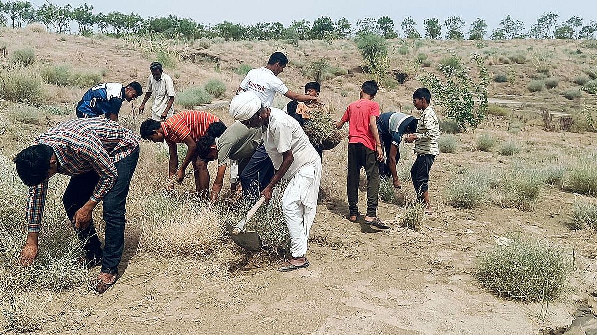 बालोतरा। बायतु एनडीकेडी स्थित पुरानी नाड़ी में श्रमदान करके इसका रूप निखारते ग्रामीण।