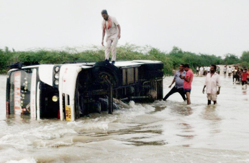 Rajasthan Weather : समदड़ी (बाड़मेर)। सुकड़ी नदी में सोमवार शाम को जोधपुर से ढीढस मजल होकर खंडप गांव की ओर जाने वाली एक निजी बस असंतुलित होकर बहते पानी में पलट गई। बस में सवार सभी बीस यात्रियों को सुरक्षित बाहर निकाल लिया गया। बस को जेसीबी की सहायता से बाहर निकाल लिया गया।