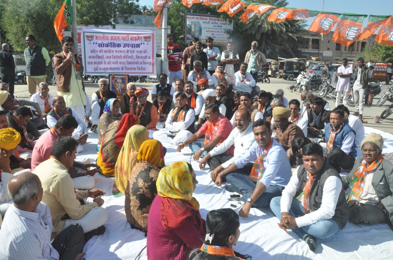 बाड़मेर. भाजपा ने संगठन के प्रदेश व्यापी कार्यक्रम के तहत जिला मुख्यायल पर गहलोत सरकार के एक वर्ष पूर्ण होने पर मुख्यमंत्री की तीन दिवसीय जश्र के विरोध में भाजपा कार्यकर्ताओं ने उपवास रखकर सोमवार को सांकेतिक धरना दिया। धरना स्थल पर वक्ताओं ने कांग्रेस सरकार की नीतियों की कड़ी आलोचना करते हुए जनता के साथ की गई वादा खिलाफी पर जमकर प्रहार किए।