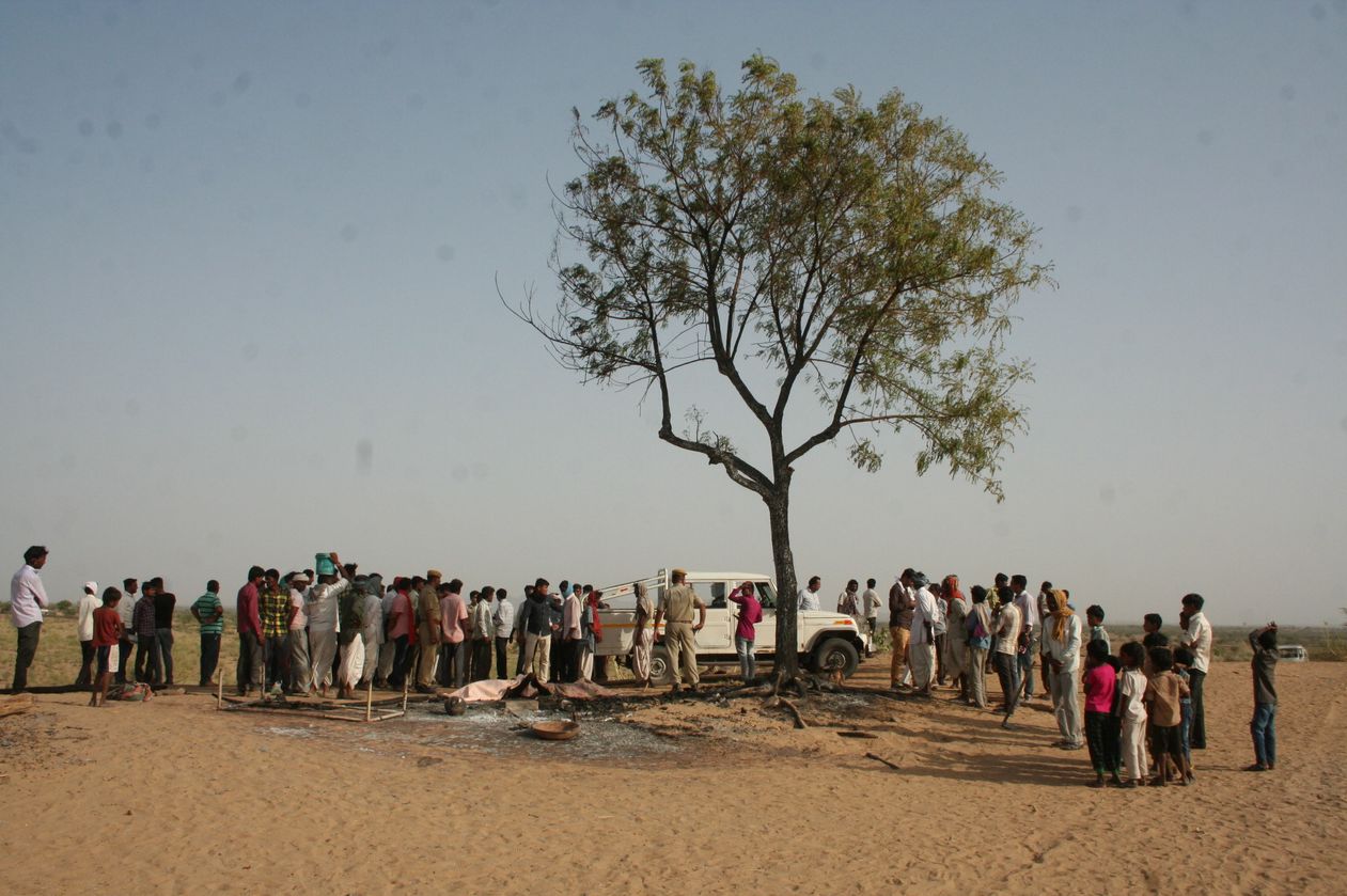 10- बालोतरा. कालमों की ढ़ाणी गांव में आग से दम्पती की मौत के बाद मौके पर मौजूद लोग।