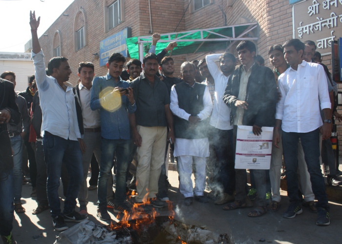 विधायक मेवाराम जैन के नेतृत्व में कांग्रेस कार्यकर्ताओं ने अस्पताल परिसर में चिकित्सा मंत्री कालीचरण सराफ व मुख्यमंत्री के खिलाफ नारेबाजी करते हुए पुतला फंूक विरोध जताया। इस मौके पर पार्षद बलवीर माली, अनिल व्यास, रिड़मलसिंह दांता, डूंगर बाना, किशोर चौधरी सहित कई जने मौजूद रहे।