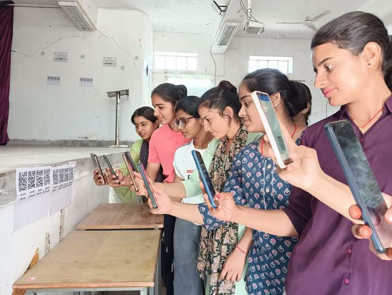 बाड़मेर की गर्ल्स कॉलेज में क्यूआर कोड स्कैन करती छात्राएं।