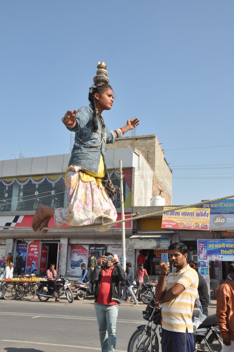 एकाग्रता- रस्सी पर साइकिल का पहिया और उसमें पांव को आगे बढ़ाते चलना। यह उस एकाग्रता का परिणाम है जिसमें उसका ध्यान केवल अपने पर है। इतनी एकाग्रता अपने कर्म के प्रति करने की सीख देती यह बालिका बता रही है कि काम कोई भी मुश्किल नहीं,बस ध्यान जरूरी है।