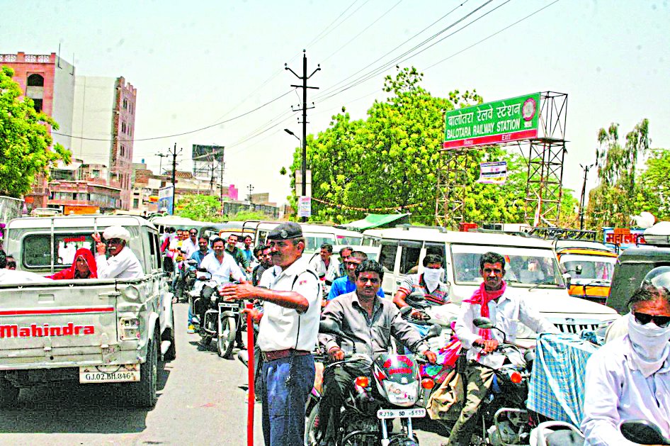 02- बालोतरा. रेलवे स्टेशन के बाहर धूप में यातायात व्यवस्था संभालता यातायातकर्मी।