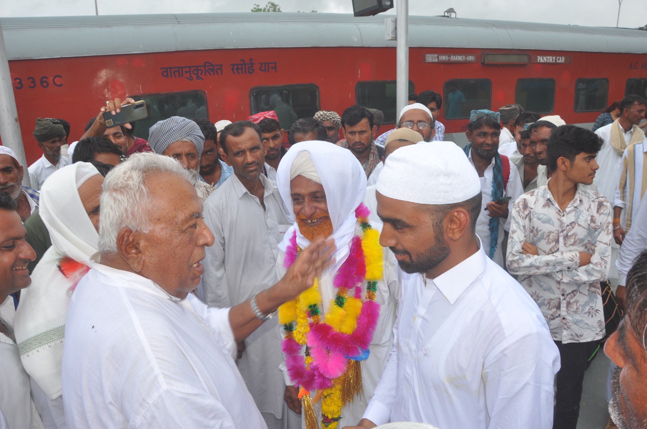 बाड़मेर. मक्का मदीना शरीफ से 40 दिन की हज की यात्रा कर बाड़मेर पहुंचे हाजियों का स्थानीय रेलवे स्टेशन पर हिंदू मुस्लिम भाइयों ने स्वागत करते भाईचारे का पैगाम दिया। हाजियों ने मुल्क की खुशहाली, सामाजिक सद्भाव, अमनों अमान, आपसी भाईचारा की दुआएं मांगी।