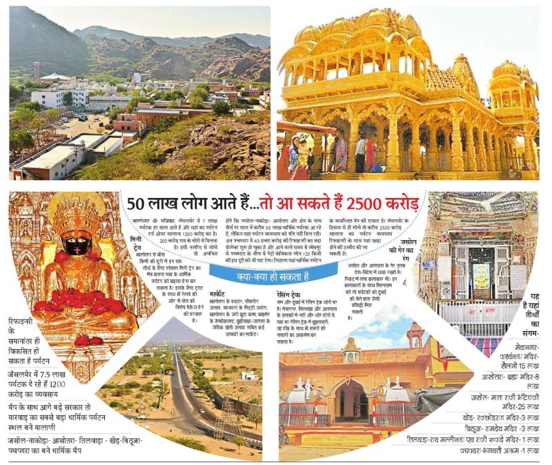 जैसलमेर में 7 लाख पर्यटक हर साल आते है और यहां का पर्यटन टर्न ओवर सालाना 1200 करोड़ का है। 200 करोड़ सम के धोरों से मिलता है। इसी नजरिए से सोचे तो अचंभित होंगे कि जसोल-नाकोड़ा- आसोतरा और क्षेत्र के पांच तीर्थ पर साल में करीब 50 लाख धार्मिक पर्यटक आ रहे है लेकिन यहां पर्यटन व्यवसाय को गति नहीं मिल रही। अब पचपदरा में 43 हजार करोड़ की रिफाइनरी का बड़ा प्रोजेक्ट शुरू हो चुका है और आने वाले समय में जोधपुर से पचपदरा के बीच में पेट्रो केमिकल जोन 120 किमी की इस दूरी को भी पाट देगा। लिहाजा यहां धार्मिक पर्यटन के व्यवस्थित मैप की दरकार है। जैसलमेर के हिसाब से ही सोचें तो करीब 2500 करोड़ सालाना का पर्यटन व्यवसाय रिफाइनरी के साथ यहां खड़ा होने की उम्मीद की जा सकती है।