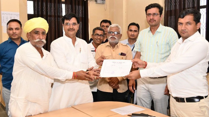 निर्दलीय प्रत्याशी राजपुरोहित को रिटर्निंग ऑफिसर प्रमाण पत्र देते हुए। फोटो पत्रिका