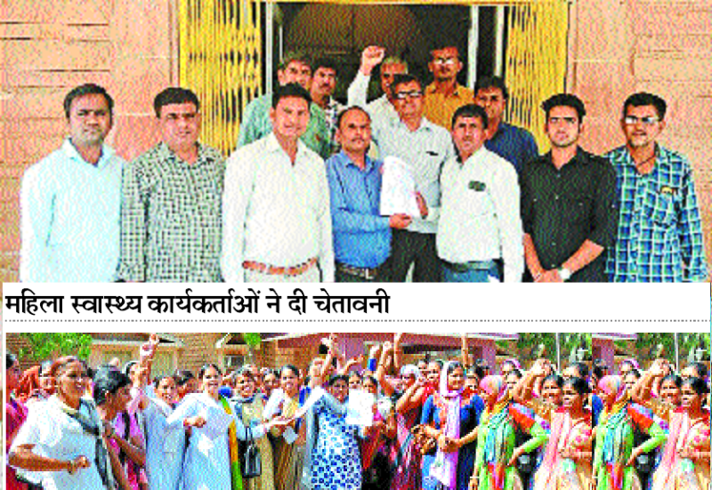 राजस्थान राज्य एलएचवी/एएनएम एसोसिएशन के बैनर तले महिला स्वास्थ्य कार्यकर्ता व दर्शिका ने मंगलवार को नौ सूत्री मांग पत्र जिला कलक्टर को सौंपकर समस्याओं के निस्तारण की मांग की। उन्होंने महिला स्वास्थ्य दर्शिका से लॉग सुपरवाइजर पर पदोन्नति, काउंसलिग के बाद नियुक्ति, नर्स गे्रड द्वितीय, वेतन कटौती नहीं करने सहित कई तरह की मांगों के निस्तारण नहीं होने पर आंदोलन की चेतावनी दी है।