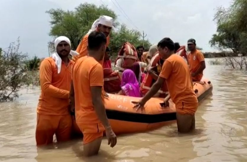 बाड़मेर के समदड़ी क्षेत्र की सुकड़ी नदी में अचानक जलस्तर बढऩे से खरंतिया और मजाल गांव में कई परिवारों के 64 लोग पानी में फंस गए। इसकी जानकारी मिलते ही प्रशासन के आला अधिकारी मौके पर पहुंचे और बचाव कार्य शुरू किया।एसडीआरएफ की टीम पानी में फंसे लोगों को रेस्क्यू किया गया।