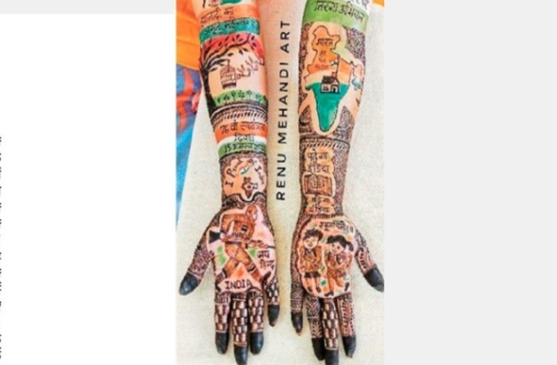 इसके साथ ही आजादी के पर्व के अवसर पर 'पढ़ेगा इंडिया', 'स्कूल चलें हम', 'जय हिंद' व 'आई प्राउड ऑफ इंडिया’ भी जैसे प्रेरणादायक संदेश हाथों पर मेहंदी से रचाए हैं। जोधपुर निवासी शिक्षिका कांता ने बताया कि उनकी ननद मेहंदी आर्टिस्ट रेणू भदरार ने यह मेहंदी लगाई है।