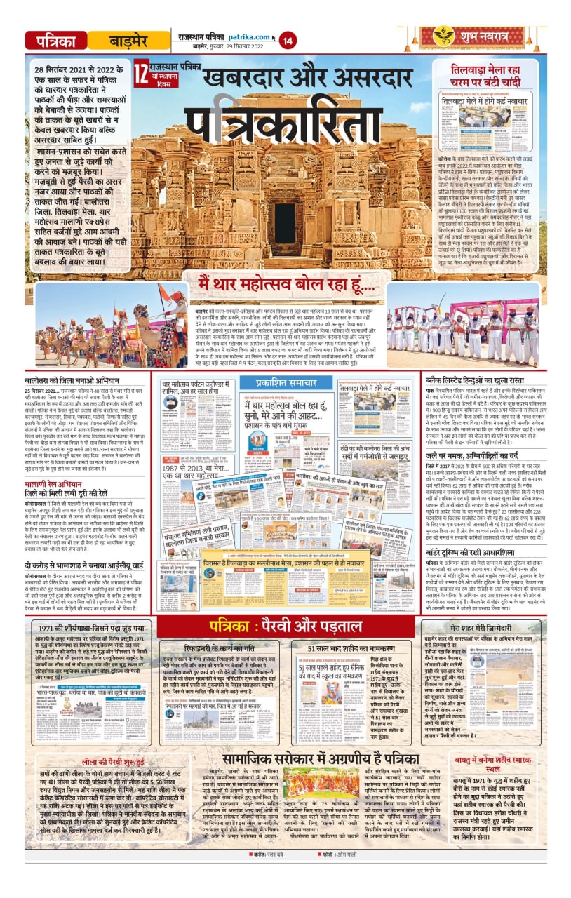 ब्लर्ब- 28 सितंबर 2021 से 2022 के एक साल के सफर में पत्रिका की पत्रकारिता की धार को और तेज किया। पाठकों की पीड़ा और समस्याओं के साथ खड़ी पत्रिका ने पाठकों की ताकत के बूते खबरों से न केवल खबरदार किया बल्कि असरदार साबित हुई। शासन-प्रशासन को सचेत करते हुए जनता े जुड़े कार्यों को करने को मजबूर किया। मजबूती से हुई पैरवी का असर नजर आया और पाठकों की ताकत जीत गई। बालोतरा जिला, तिलवाड़ा मेला, थार महोत्सव मालाणी एक्सप्रेस सहित दर्जनों मुद्दे आम आदमी की आवाज बने । पाठकों की यही ताकत पत्रकारिता के बूते बदलाव की बयार लाया।