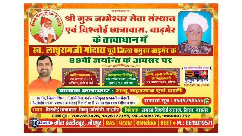 खीचड़ ने बताया कि कार्यक्रम में 28 अगस्त को रात्रि एक शाम गुरु जम्भेश्वर के नाम जागरण में संत राजू महाराज एवं पार्टी भजनों की प्रस्तुति देगी।