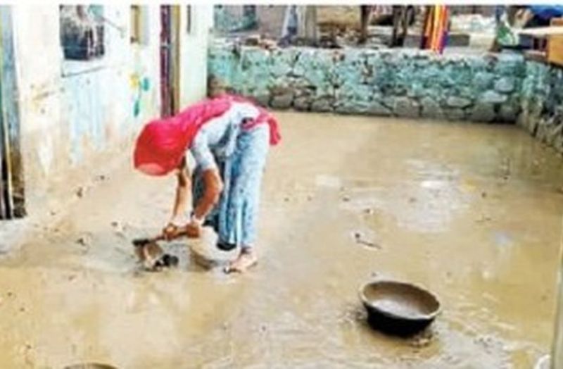 चौहटन में चक्रवाती तुफान के बाद घर में आए पानी व कीचड को साफ करते हुए।