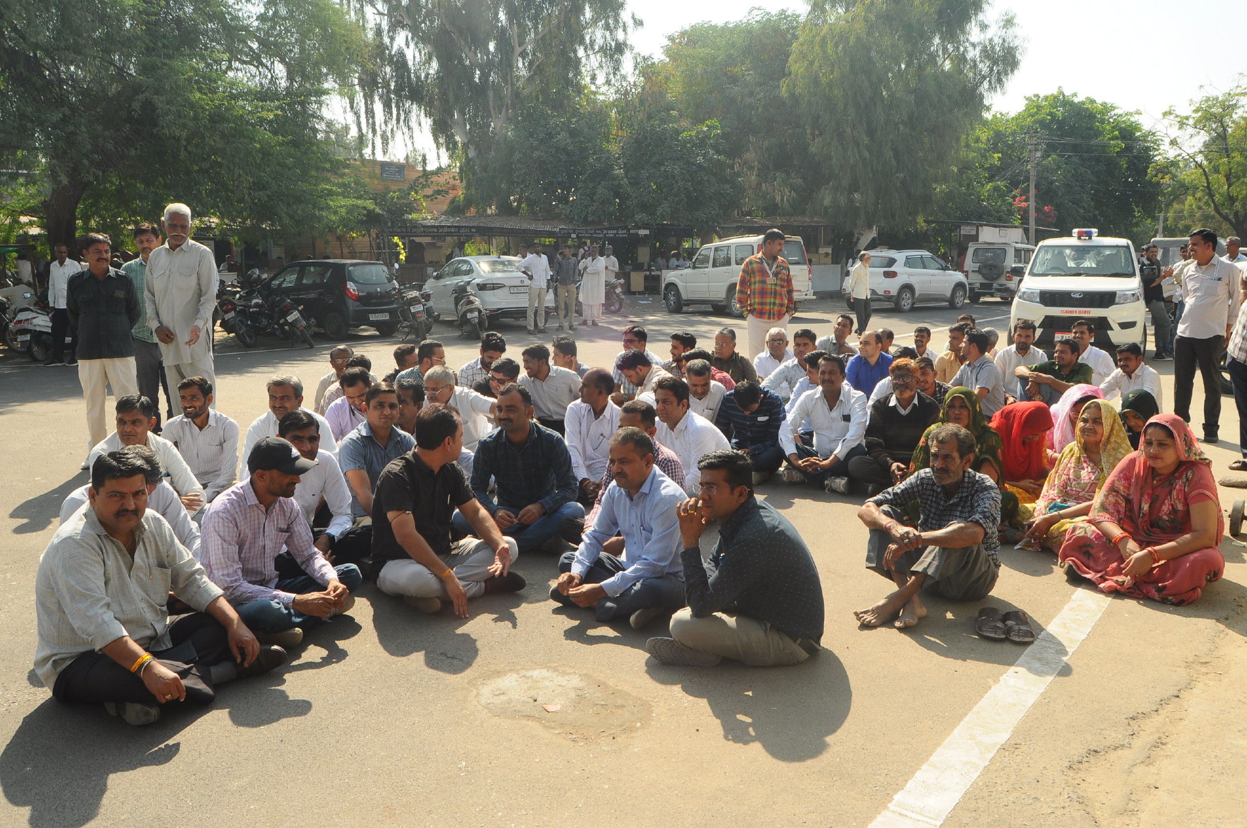 बाड़मेर कलेक्ट्रेट में धरने पर बैठे कर्मचारी।