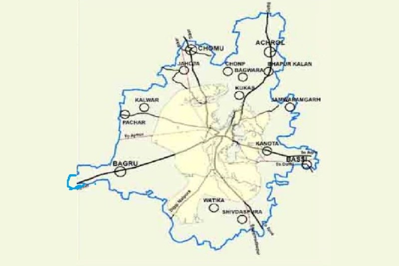 मास्टर प्लान के मुताबिक अचरोल, भानपुर कलां, जमवारामगढ़, बस्सी, कानोता, वाटिका, बगरू, कालवाड़, कूकस, जाहोता और चौमूं को सैटेलाइट टाउन के साथ ही बगवाड़ा, चौंप, पचार और शिवदासपुरा व चंदलाई को ग्रोथ सेंटर के रूप में विकसित किया जाना था।