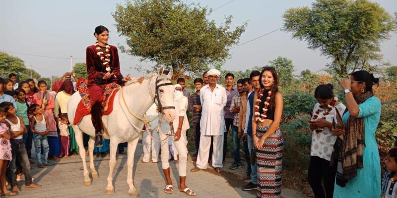 जयपुर . कोटपूतली --मॉडलिंग जगत में नाम कमाने वाली कोटपूतली के शुकलाबास की बेटी निशा यादव शनिवार को अपने गांव पहुंची। निशान यहां दिवाली का त्योहार मनाने मुंबई से आई है। निशा के साथ लंदन की मॉडल अनिशा और निंजना सिंह भी साथ आई हैं। निशा का गांव में बैंड बाजे के साथ स्वागत किया गया। गांव की महिलाओं ने गीत गाकर निशा का स्वागत किया। वहीं गांव के युवकों ने डीजे पर डांस किया। निशा ने भी ग्रामीणों का अभिवादन किया।