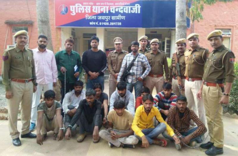 चंदवाजी थाना पुलिस ने लूट गिरोह कापर्दाफाश करते हुए रामगढ़ जिला अलवर निवासी नासिर मेव, इकबाल उर्फ चिंटूमेव, चंडीगढ़ थाना रामगढ़ अलवर निवासीसंजय यादव, फकरु उर्फ कंजा खान, मुस्ताक उर्फ कन्नड़, एमआईए थाना अलवरनिवासी भगवान पुत्र जुम्मा, खानपुर नगीना अलवर निवासी अली शेर खान, अलावड़ा थानारामपुर निवासी जसविंदर व सब्बन खान तथा शेखपुर अलवर निवासी तारीक खान कोगिरफ्तार किया है। गिरफ्तारआरोपियों से अन्य वारदातों के खुलने का भी अंदेशा जताया जा रहा है। पुलिसआरोपियों से पूछताछ कर रही है। आरोपियों के खिलाफ अलवर के विभ्भ्रिनथानों में मारपीट, लूट, डकैती व आमर््स एक्ट के अन्य मामले भी दर्ज हैं।