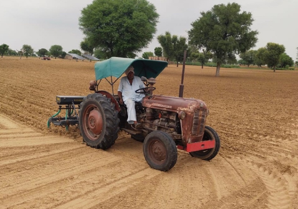 चौमूं के अणतपुरा चिमनपुरा में खेत में ट्रैक्टर से बुवाई करता किसान।