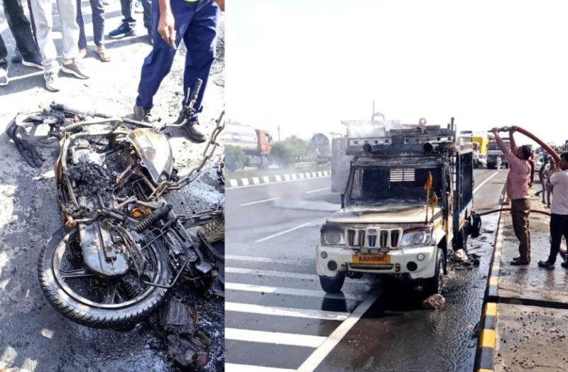इस दौरान चालक ने वाहन को अजमेर रोड बाइपास की ओर दौडा दिया। मोटरसाइकिल पिकअप के नीचे ही फंस गई। चालक ने सोचा कि मोटरसाइकिल पिकअप से अलग हो जाएगी लेकिन मोटरसाइकिल पिकअप के चलने के साथ ही उसमें अटकती रही। चालक पिकअप को करीब तीन किलोमीटर चलाकर बलाड रोड बाइपास तक ले गया। यहां पहुंचने पर मोटरसाइकिल की टंकी फट गई। उससे निकले पेट्रोल ने आग पकड ली। देखते ही देखते आग की लपटें तेज हो गई।