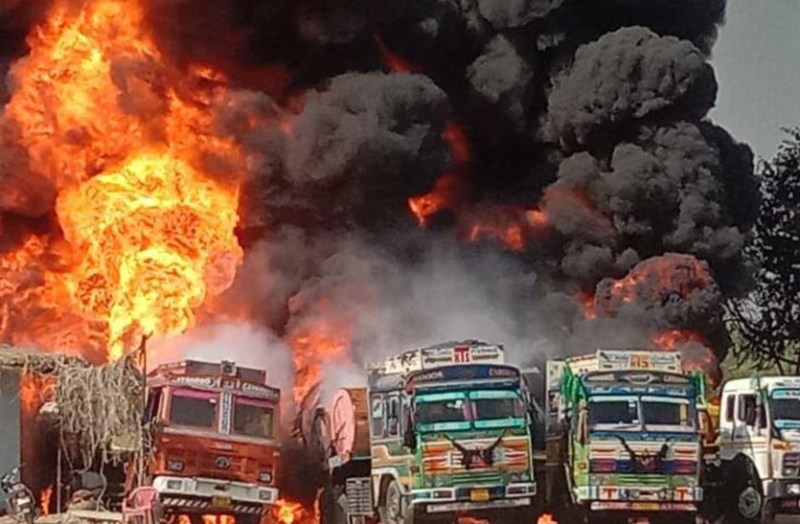 इससे पहले कि वहां मौजूद लोग कुछ समझ पाते इससे पहले टैंकर धूं-धूं कर जलने लगा। देखते ही देखते आग की लपटों ने विकराल रूप ले लिया। इसके बाद पास ही खड़े ट्रेलर में रखी केबल बॉक्स, अन्य ट्रेलर में भरे ड्रम ने भी आग पकड ली। देखते ही देखते ही आग की लपटें विकराल होती गई। इसके कारण उठता धुएं का गुबार दो किलोमीटर दूर से ही नजर आने लगा। इस दौरान होटल पर मौजूद लोग अपने-अपने वाहन लेकर भाग छूटे। होटल में काम कर रहे लोग भी मौके से चलते बने।