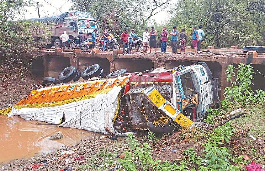 Bemetera Road Accident : देवकर. नगर गौरव पथ मार्ग (Dhamtari news)के ठीक आगे ग्राम नवकेशा नाला पुल से रविवार रात अचानक अनियंत्रित( Heavy rain in Chhattisgarh) होकर सरिया से लदा हुआ ट्रक नीचे गिर गया। दुर्घटना की वजह पुल में जानलेवा गड्ढे को बताया जा रहा है। पुल के ऊपर गड्ढों में बरसात का पानी( CG rain) भरे होने से गहराई का ( CG local news) अंदाजा नहीं लग पाया और गाड़ी अनियंत्रित होकर पुल से नीचे जा गिरी। दुर्घटना में चालक और परिचालक दोनों सुरक्षित बताए जा रहे हैं। दोनों को मामूली चोटें आई हैं।