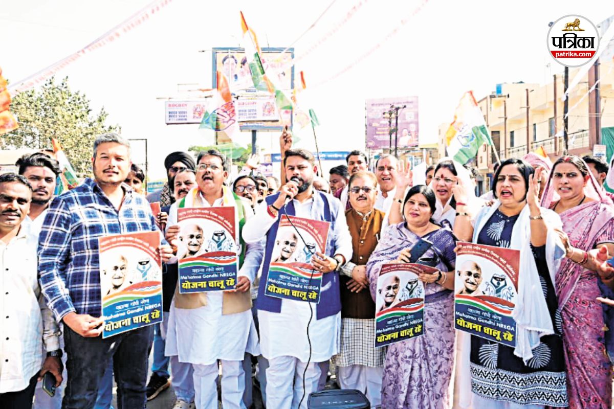 मनरेगा का नाम बदलने से नाराज कांग्रेसियों का विरोध प्रदर्शन (फोटो सोर्स- पत्रिका)