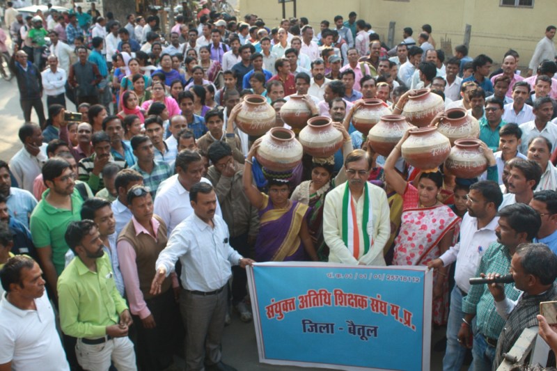 बैतूल। शासकीय स्कूलों में वर्षो से अतिथि शिक्षक के पद पर कार्य करने वाले अतिथि शिक्षकों ने सोमवार को कलेक्टोरेट के सामने सरकार की नीतियों के विरोध में मटके फोडक़र अपना आक्रोश व्यक्त किया। इस दौरान वरिष्ठ कांग्रेसी नेता अजय शाह भी शिक्षकों के समर्थन में उतरकर विरोध प्रदर्शन करते नजर आए। अतिथि शिक्षकों का कहना था कि वे पिछले १० वर्षो से एक ही मानदेय पर कार्य कर रहे है, उसके बाद भी सरकार द्वारा अतिथि शिक्षकों की मांगों पर अमल नहीं किया जा रहा है। संघ के जिला अध्यक्ष केसी पवांर ने बताया कि पिछले दस वर्षो से सरकार से विभागीय परीक्षा का आयोजन कर नियमित करने की मांग कर रहे है, जिसके बाद भी सरकार द्वारा मांगों पर विचार नहीं किया जा रहा है। उनका कहना कि सरकार का घड़ा भर गया है। अब सरकार को गिराने के लिए मजबूर होकर अतिथि शिक्षकों को सडक़ पर उतरना पड़ रहा है। सरकार के नीतियों के विरोध में मटके फोडक़र विरोध दर्ज करना पड़ रहा है। संगठन के जिला उपाध्यक्ष नीरज वर्मा ने बताया कि अतिथि शिक्षकों को पिछले १० वर्षो से सरकार द्वारा वर्गवार अलग-अलग मानदेय दिया जा रहा है, जिसमें वर्ग-३ को १०० रूपए, वर्ग-२ को १५० और वर्ग-१ के लिए १८० प्रतिदिन के हिसाब से मानदेय दिया जा रहा है। कम मानदेय में गुजर बसर करना मुश्किल हो रहा । जिले भर के अतिथि शिक्षकों ने कर्मचारी भवन में धरना प्रदर्शन का आयोजन किया गया। धरने के बाद में अतिथि शिक्षकों ने कर्मचारी भवन से एक मटका रैली का आयोजन किया। रैली के रूप में कलेक्टोरेटे पहुंचे अतिथि शिक्षकों ने कलेक्टर कार्यालय के मामने मटके फोडक़र मुख्यमंत्री के नाम का जिला प्रशासन को ज्ञापन सौंपा। अतिथि शिक्षकों की हड़ताल का समर्थन करने के लिए कांग्रेसी नेता अजय शाह धरना स्थल पर पहुंचे। अतिथि शिक्षकों की मटका रैली में भी शामिल हुए।