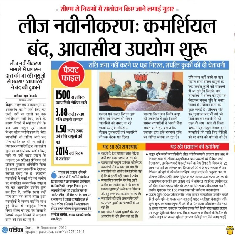 बताया गया कि भारतीय जनता पार्टी के जिलाध्यक्ष जितेन्द्र कपूर एवं बैतूल के विधायक हेमंत खंडेलवाल के प्रयासों से राज्य शासन ने नजूल के स्थाई पटटाधारियों को राहत देेते हुए प्रकरण में अंतिम निर्णय होने तक वसूली की कार्रवाई पर रोक लगाने के आदेश दिए है। गौरतलब है कि नजूल के स्थाई पटटाधारियों की समस्याओ को लेकर विगत दिनों भाजपा व्यापारी प्रकोष्ठ के जिला संयोजक मनोज भार्गव की पहल पर भाजपा कार्यालय में नगर के स्थाई पटटे वाले व्यापारियों की भाजपा जिलाध्यक्ष जितेन्द्र कपूर के साथ बैठक हुई थी। बैठक के पश्चात कपूर ने मुख्यमंत्री शिवराज सिंह चौहान ,राजस्वमंत्री उमा शंकर गुप्ता को पटटाधारियों की समस्याओं से अवगत कराते हुए अंतिम निर्णय होने तक वसूली राशी पर रोक लगाने हेतू सभी कलेक्टर्स को तत्काल आदेश देने का निवेदन किया था। इस सबंध में मुख्यमंत्री कार्यालय द्वारा भाजपा जिलाध्यक्ष जितेन्द्र कपूर को भेजे गए पत्र मे बताया गया कि प्रकरण मे अंतिम निर्णय होने तक सभी कलेक्टर्स को राशी वसूली की कार्यवाही पर रोक लगाने के तत्काल आदेश दिए गए है। मुख्यमंत्री कार्यालय से भेजे गए पत्र मे जिलाध्यक्ष कपूर द्वारा विसंगतियो पर उठाए गए बिन्दुओं के सबंध मे बताया गया कि इस सबंध मे शासन द्वारा निर्णय लिया जाएगा। जिसका एक समिति द्वारा परीक्षण किया जा रहा है। इस संबंध में स्थानीय विधायक हेमंत खंडेलवाल द्वारा भी मुख्यमंत्री ,राजस्व मंत्री से मुलाकात कर स्थाई पटटाधारियों की समस्या बताई गई थी। उल्लेखनीय हो कि पत्रिका ने सबसे पहले इस मामले को उठाया था और लगातार खबरें प्रकाशित कर जनप्रतिनिधियों के संज्ञान में लाया था। जिसके बाद जनप्रतिनिधियों ने व्यापारियों की इस समस्या को मुख्यमंत्री एवं राजस्व मंत्री के सामने लाया। जिसके बाद मुख्यमंत्री ने राजस्व अमले को वसूली स्थगित करने के निर्देश जारी किए।