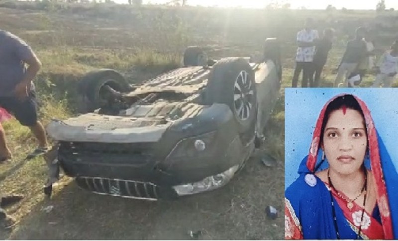 हरदा. बाइक को टक्कर मारने के बाद कार खेत में पलट गई। मृतक क्षमाबाई रंगीले।
