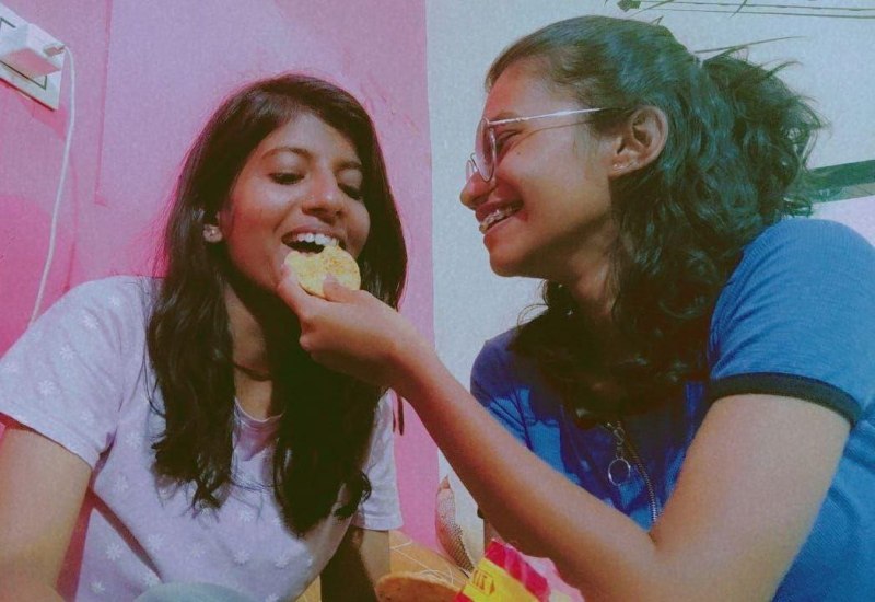 हरदा. प्रदेश में टॉपर बनने पर अपनी साथी छात्रा प्रियंका को मिठाई खिलातीं छात्रा श्रुति गुर्जर।