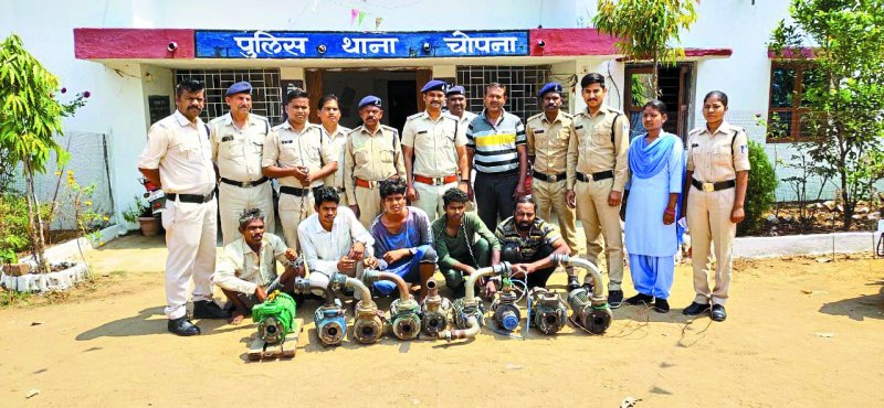 चोपना. चोपना पुलिस ने खेतों से मोटरपंप चोरी करने वाले गिरोह को पकड़ा है। पांच आरोपियों को पकड़कर नौ मोटर जब्त की है। जिसकी कीमत लगभग एक लाख रुपए हैं। आरोपियों द्वारा पड़ोसी जिले होशंगाबाद से भी पानी की मोटर चुराई गई थी। आरोपियों द्वारा अपने शौक पूरा करने घटना को अंजाम दिया जाता था। काम पर रखने के बहाने के चोरी की जाती थी। चोपना थाना प्रभारी जीएस राजपूत ने मामले की जानकारी देते हुए बताया कि क्षेत्र में लगातार खेतों से पानी की मोटरें चोरी हो रही थी। मिथुन विश्वास, मुत्युंजय सरकार, विवेकानंद बैरागी के खेत से पानी की मोटरें चोरी हो गई थी। अज्ञात चोरों पर केस दर्ज किया था। संदेह के आधार पर कुछ आरोपियों को पकड़कर पूछताछ की गई। जिसमें उन्होंने चोरी की वारदात को अंजाम देना स्वीकार किया है। पुलिस ने मोटर पंप चोरी के आरोप में छतरसिंह, दिलीप, कैलाश,गुड्डू मुन्नालाल सभी निवासी सालीवाड़ा को गिरफ्तार किया है। आरोपियों के पास से पानी की नौ मोटर जब्त की है। आरोपियों के द्वारा छह मोटर पंप होशंगाबाद के केसला से चोरी किए गए थे। मोटर पंप की कीमत लगभग एक लाख रुपए हैं। आरोपियों छतरसिंह, कैलाश और दिलीप ने बताया कि सभी मिलकर चोरी घटना को अंजाम देते थे। होशंगाबाद के ग्राम केसला से भी छह पानी की मोटर चोरी की थी। थाना प्रभारी चोपना ने बताया कि अपने शौक को पूरा करने चोरी की घटना करते थे।