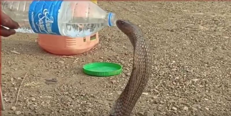 गोदाम से पकड़े गए कोबरा सांप को जब स्नेक कैचर श्रीकांत विश्वकर्मा जंगल में छोड़ने के लिए गए तो उन्होंने देखा कि सांप काफी घबराया हुआ था। ऐसे में उन्होंने अपने पास रखी पानी की बोतल निकाली और सांप को पानी पिलाया तो वो पानी पीने लगा। इसी दौरान मौके पर मौजूद श्रीकांत के साथी ने सांप के बोतल से पानी पीने का वीडियो अपने मोबाइल से बना लिया जो अब तेजी से वायरल हो रहा है। सर्प मित्र श्रीकांत ने बताया कि कोबरा सांप काफी जहरीला होता है और इसके काटने से कुछ ही देर में इलाज न मिलने से इंसान की मौत हो जाती है।