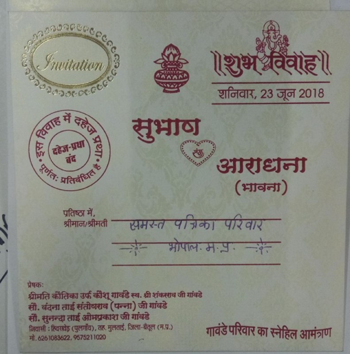इस विवाह में दहेज प्रथा पूर्णत: प्रतिबंधित है, मुलताई तहसील के हिवरखेड़ निवासी गावंडे परिवार ने शादी की पत्रिका में यह लिखाया है
